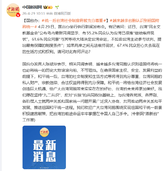 国台办发言人陈斌华表示,相关民调表明,越来越多台湾同胞认识到祖国终将统一也必将统一的历史大势滚滚向前、不可阻挡。在确保国家主权、安全、发展利益的前提下,和平统一后,台湾的社会制度和生活方式等将得到充分尊重,台湾同胞的私人财产、宗教信仰、合法权益将得到充分保障。和平统一将给台湾经济社会发展创造巨大机遇,给广大台湾同胞带来实实在在的好处,台湾的未来将更加美好。我们愿在坚持“九二共识”、反对“台独”的共同政治基础上,与台湾各党派、各界别、各阶层人士就两岸关系和国家统一问题开展广泛深入协商,共同推动两岸关系和平发展、推进祖国和平统一进程。我们欢迎广大台湾同胞围绕实现祖国和平统一前景积极建言献策,把台湾的前途命运牢牢掌握在中国人自己手中。(中新网“燕新台”工作室)
