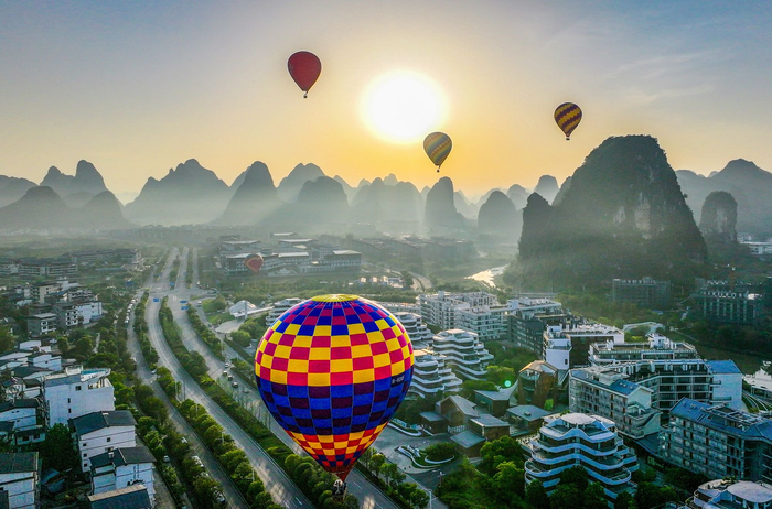 暮春时节,在遇龙河上空,热气球迎着朝阳,满载憧憬缓缓升起。薄雾如烟似纱,缠绵萦绕层叠青山与临水民居,将春日山野晕染成一幅缓缓舒展的诗意长卷。(阳朔县纪委监委供 黄韦君/摄)