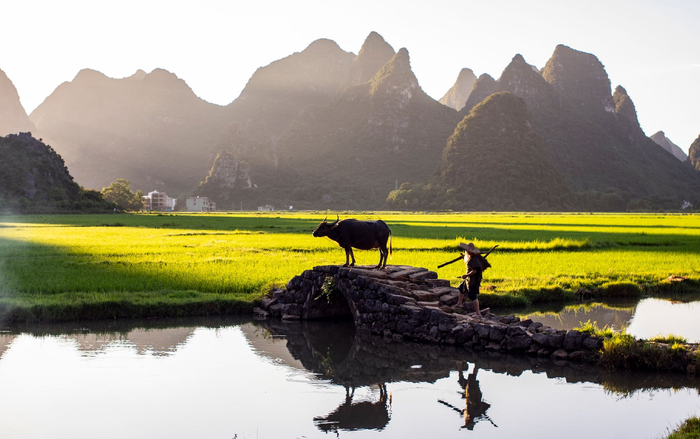 在桂林市临桂区四塘镇田心村的状元桥上,老农牵着水牛缓缓走过,晨光驱散山雾,一桥一水、一牛一人,尽显桂林山水独有的东方诗意。(桂林市纪委监委驻桂林投资集团纪检监察组供 潘元/摄)