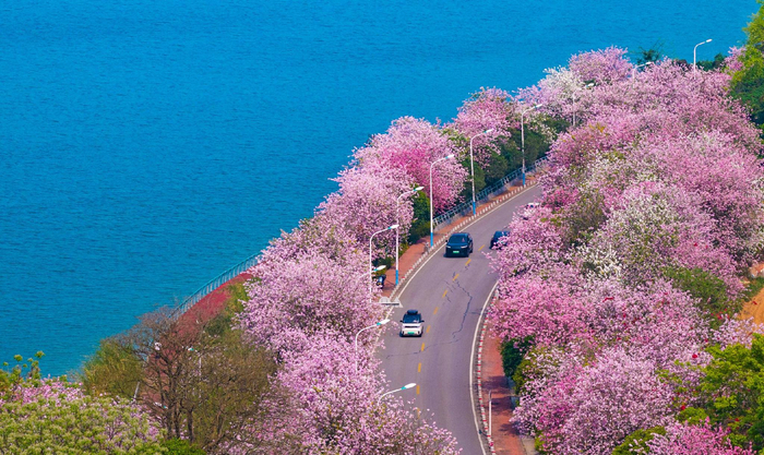 四月的柳州,柳江河畔洋紫荆盛放,粉白繁花如云似霞,与一江碧水相映成画。车辆穿行滨江花道,路在景中、人在画里,尽显“紫荆花城”的春日诗意与生态之美。(柳州市鱼峰区纪委监委供 黎寒池/摄)