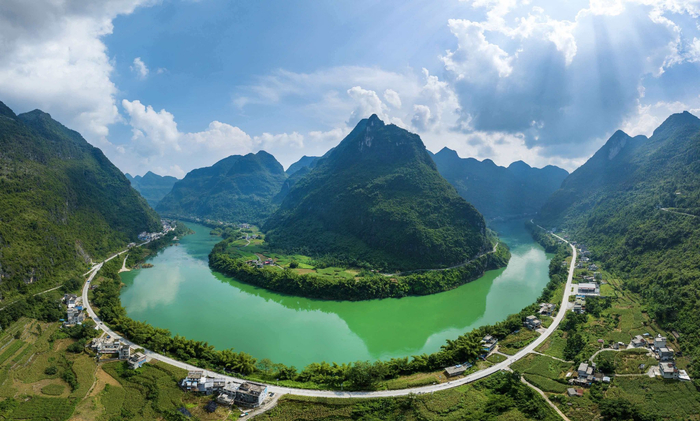 四月晴光染翠峰,红水河畔春意浓。河池市都安县箐盛乡箐盛湾,碧水蜿蜒环抱青山,天光云影共徘徊,铺展一卷清丽绝美的八桂山河图。(宾阳县纪委监委供 曾祥忠/摄)
