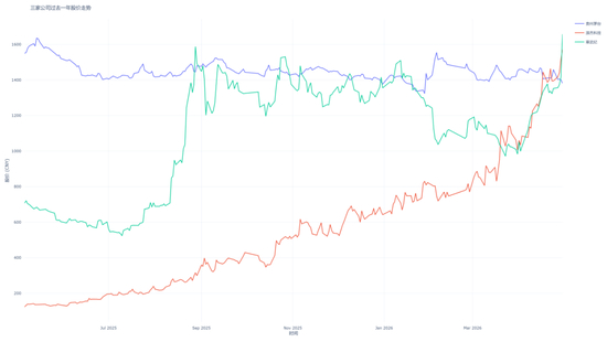 ▲过去一年,贵州茅台(蓝色)、寒武纪(绿色)、源杰科技(红色)三家公司股价走势图。新京报贝壳财经记者罗亦丹使用Wind制作