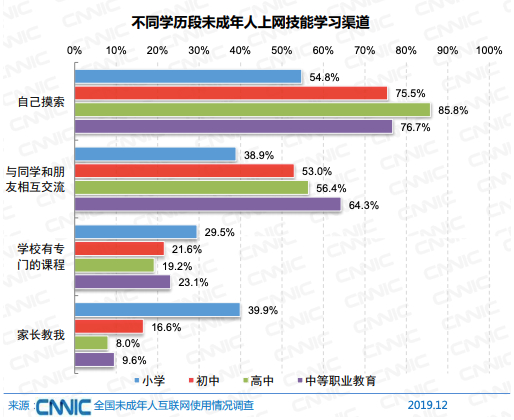 《报告》显示,65.6%的未成年网民主要通过自己摸索来学习上网技能,通过学校学习获得上网技能的为25.7%。目前的网络素养教育尚未形成统一、标准的教学体系,网络操作技能、网络防沉迷知识、自护意识和能力需要得到加强。