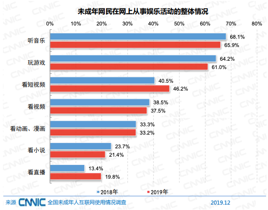 调查发现,听音乐和玩游戏仍然是未成年人最主要的网上娱乐活动。玩游戏方面,手机游戏占56.3%,电脑游戏占24.6%。看短视频和网络直播的比例,分别比2018年提升5.7和6.4个百分点。上网聊天是未成年人最主要的网上沟通社交方式,占58.0%。