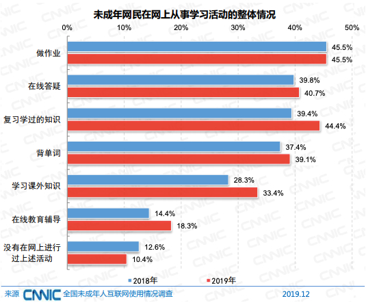 调查发现,未成年人的网上学习,依次是:做作业(45.5%)、复习学过的知识(44.4%)、在线答疑(40.7%)、背单词(39.1%)、学习课外知识(33.4%)、在线教育辅导(18.3%)。在网上学习领域,成年人主要是搜索、获取信息,未成年人则更多表现为课堂教育的延伸。