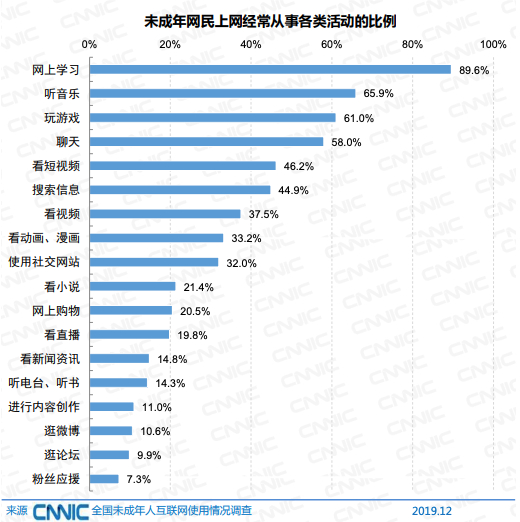 调查发现,未成年网民上网经常从事的各类活动中,排在前三位的是网上学习(89.6%)、听音乐(65.9%)、玩游戏(61.0%)。其他还包括:上网聊天(58.0%)、看短视频(46.2%)、搜索信息(44.9%)、看视频(37.5%)、看动画或漫画(33.2%)、使用社交网站(32.0%)等。