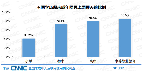 调查发现,小学生在网上从事聊天、使用社交网站、逛微博、逛论坛、看新闻、购物等各类社会化活动的比例,均明显低于其他学历段,初中开始则出现显著增长。如初中生上网聊天、使用社交网站查看或回复好友状态的比例,分别比小学生增长31.5和29.8个百分点。