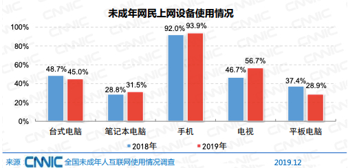 调查发现,未成年网民使用各类上网设备的比例,依次是手机(93.9%)、电视(56.7%)、台式电脑(45.0%)、笔记本电脑(31.5%)、平板电脑(28.9%)。未成年网民中,拥有属于自己的上网设备达到74.0%,其中自己有上网手机的为63.6%。