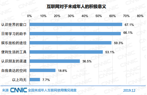调查发现,未成年人认为互联网主要是:认识世界的窗口(67.1%)、日常学习的助手(66.1%)、娱乐放松的途径(59.3%)、便利生活的工具(53.1%)、认识朋友的渠道(36.5%)、自我表达的空间(18.8%)。可见未成年人对互联网有自己的认知和态度。