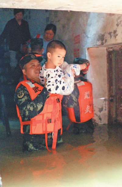 7月8日,武警湖北总队咸宁支队官兵在赤壁城区陆水河附近的小区展开救援工作。