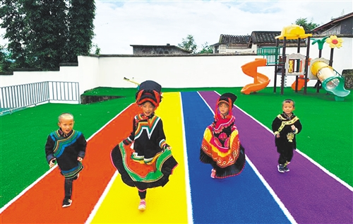 图② 普格县螺髻山镇子热村幼教点内,彝族小朋友正在操场上做游戏。 杨尚威摄(中经视觉)