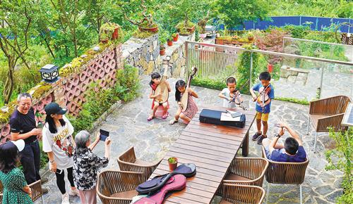 7月30日,重庆市武隆区仙女山国家级旅游度假区的高端民宿归原小镇内,前来旅游的游客在民宿小院里休闲娱乐。 新华社记者 刘 潺摄