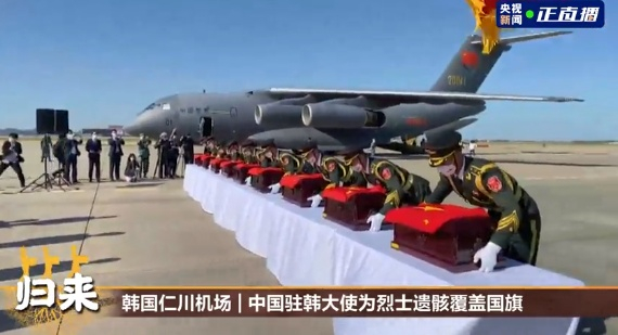 第六批10位在韩中国人民志愿军烈士遗骸在仁川机场正式举行遗骸交接仪式后,由中国空军专机接运,回到祖国和人民的怀抱;