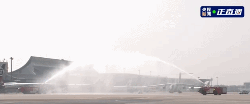 “过水门”是民航界的最高级别礼仪,寓意着接风洗尘。今天,当运-20专机降落在沈阳桃仙国际机场后,两侧的消防车同时喷射水柱,形成一道壮观的水门,意在向抗美援朝烈士致以最为崇高的敬意。