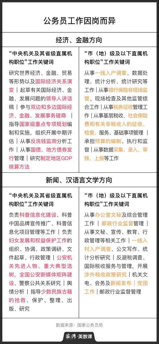 以国考为例,岗位可以划分为“中央机关及其省级直属机构职位”和“市(地)级及以下直属机构职位”两类。这两类岗位存在一定程度的差异化定位,前者较侧重宏观分析,研究、评估、规划是工作内容的常见词;后者侧重解决实际问题,工作内容细致琐碎。