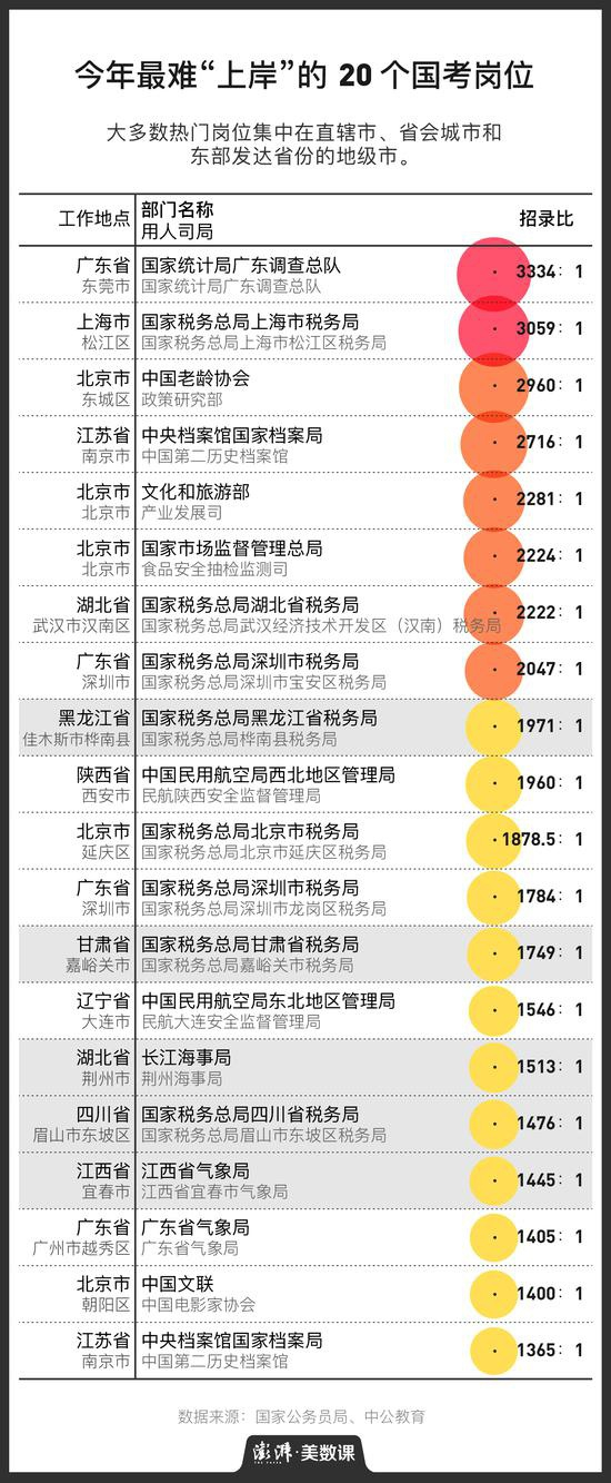 拿2021年国考最难“上岸”的20个岗位为例,其中有15个职位分布在直辖市、省会城市、东部发达省份地级市,各地税务局是热门单位。另有5个岗位出现在黑龙江省佳木斯市、甘肃省嘉峪关市、湖北省荆州市、四川省眉山市和江西省宜春市。