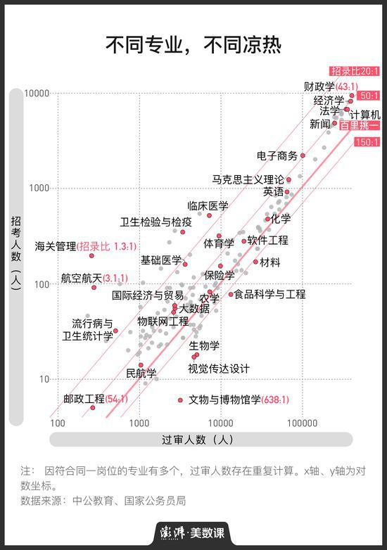 我们绘制了若干条招录比的分界线,最中心一条是“百里挑一”,即在100个考生中最终招录一人。在图中,越往右下,招录激烈程度越高;越往左上,招录激烈程度越低。