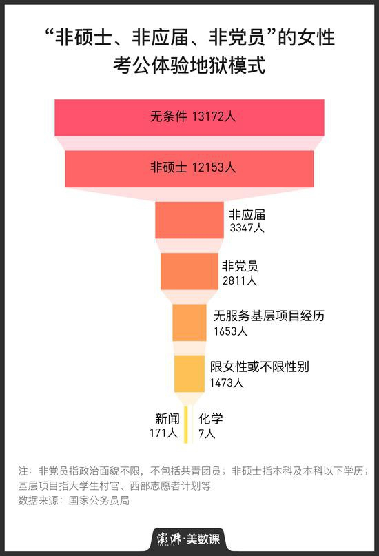 先不考虑专业,广义上进行计算,一位非党员、非硕士、非应届、无服务基层项目经历的女性,将体验何种报考难度?一轮轮筛选后,约12000个的岗位对上述三非女性关上了大门。