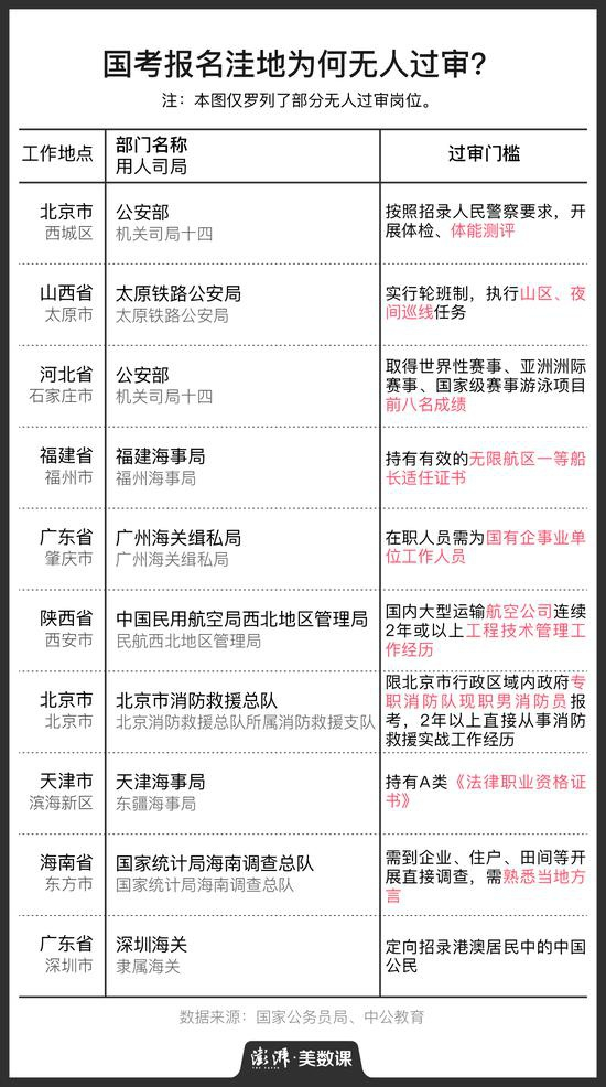 而在本次国考报名中,也有岗位无人过审。据中公教育,截至10月24日17:30(报名截止时间),尚有168个岗位过审人数为0,其中也不乏来自北京、上海等中心城市的岗位。这又是什么原因造成的?