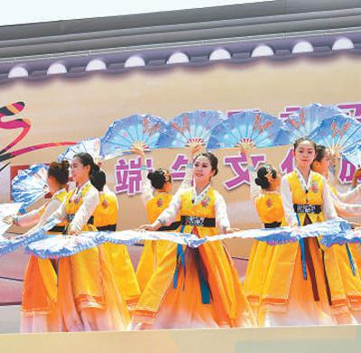 在明东村端午文化旅游节上,孩子们在表演传统扇子舞。