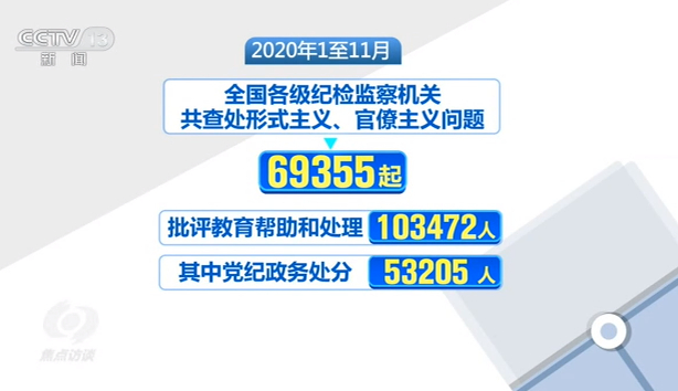 刚刚过去的一年,在统筹推进疫情防控和经济社会发展工作中,广大党员干部勇于担当、攻坚克难,给人们留下了深刻的印象。但同时一些形式主义、官僚主义问题,也引起了人们的关注。中央纪委国家监委数据显示,2020年1至11月,全国各级纪检监察机关共查处形式主义、官僚主义问题69355起,批评教育帮助和处理103472人,其中党纪政务处分53205人。