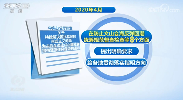为进一步破除形式主义束缚,让干部有更多时间和精力抓落实,按照党中央和习近平总书记的部署要求,2020年4月,中央办公厅印发了《关于持续解决困扰基层的形式主义问题 为决胜全面建成小康社会提供坚强作风保证的通知》,在防止文山会海反弹回潮、统筹规范督查检查等8个方面,提出了明确要求,给各地贯彻落实指明了方向。