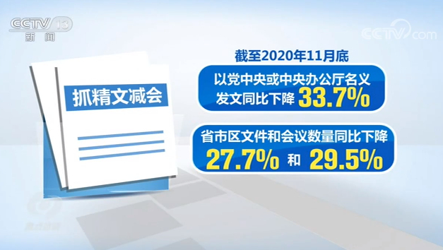 抓精文减会,这是2020年整治形式主义为基层减负的一项重点工作。截至2020年11月底,以党中央或中央办公厅名义发文同比下降33.7%,省市区文件和会议数量同比下降27.7%和29.5%。2020年2月23日,党中央以视频会议方式召开统筹推进疫情防控和经济社会发展工作部署会,将会议直接开到县团级,全国有17万人参加。中央率先垂范,推动基层会风有了明显改善。在基层,越来越多的地方也都开始了高效、务实的会风转变。