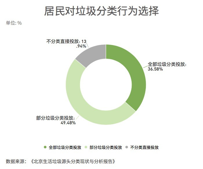 从这些数据与上面对居民分类意愿数据的比较中,可以明显看出居民分类意愿与行为存在一定偏离,84.56%的支持垃圾分类的意愿比例与36.58%的全部垃圾分类投放比例存在一定偏离。