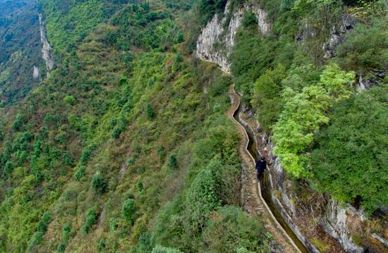 黄大发在巡查水渠途中,身旁就是悬崖。(新华社记者刘续2017年3月24日摄)