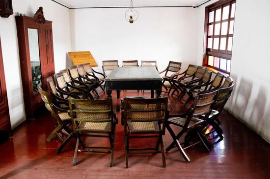 踩着木楼梯来到二楼的一个房间,地面铺着红木地板,天花板上吊着一盏煤油灯,中间放着一张长方形的桌子,椅子围成一圈。