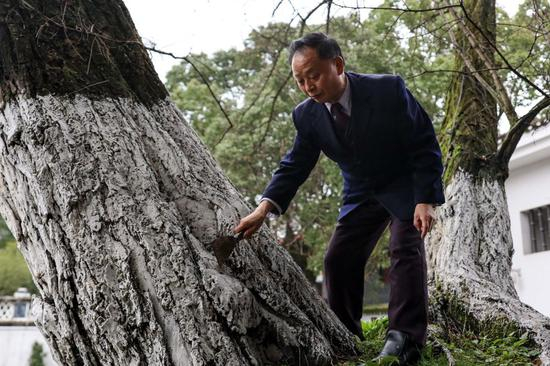 “这些年来,大大小小的病虫害它都遇到过。”张本光说,“就像一个政党,发展道路上也会碰到各种问题,关键是要向恶疾亮剑,对病灶开刀。”他拿着枝剪、铲子等工具,一面为大槐树清理青苔、修剪枝条,一面对记者说。他会定期来会址,义务为大槐树做“体检”,以预防病虫害。