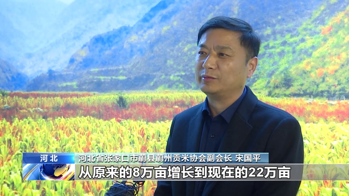 河北省张家口市蔚县蔚州贡米协会副会长 宋国平:太行山高速开通之后,小米产业种植面积从原来的8万亩增长到现在的22万亩,实现销售收入7.5亿元,带动农户总数达到9300多户,极大带动了当地小米产业的发展。