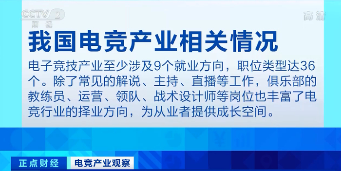 据统计,电子竞技产业至少涉及9个就业方向,职位类型达36个。除了常见的解说、主持、直播等工作,俱乐部的教练员、运营、领队、战术设计师等岗位也丰富了电竞行业的择业方向,为从业者提供成长空间。