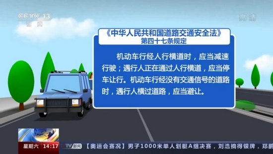 《中华人民共和国道路交通安全法》第四十七条规定:机动车行经人行横道时,应当减速行驶;遇行人正在通过人行横道,应当停车让行。机动车行经没有交通信号的道路时,遇行人横过道路,应当避让。