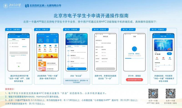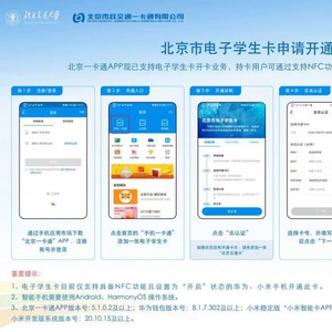 在卡片申领环节,只要是符合条件的高校在校生,便可通过支持NFC功能的智能手机在线开通。具体方法为登陆最新版“北京一卡通”APP并确保已开通过手机一卡通(卡面需带有“交通联合”标识),再在“手机一卡通”中选择“添加一张电子学生卡”,按页面提示输入学校、姓名、学号、证件号等信息进行实名认证,待认证完成后原手机一卡通即可成功升级为电子学生卡。目前,华为、小米品牌手机(具备NFC功能机型)已率先支持电子学生卡开卡服务,接下来更多手机品牌也将陆续支持。