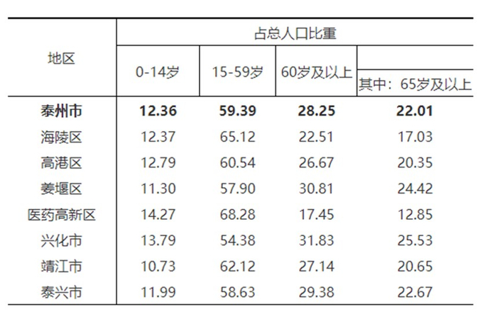 同处苏中地区的泰州65岁及以上人口占比也达到了22.01%;与2010年相比,其60岁及以上人口的比重上升7.43个百分点,65岁及以上人口比重上升7.78个百分点。分区域来看,泰州除了医药高新区65岁及以上人口比重低于14%外,其余的区、县级市都高于14%,其中兴化市达到了25.53%,姜堰区也达到了24.42%。