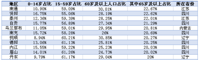 有11个城市已经进入超老龄化阶段,分别是南通、资阳、泰州、自贡、乌兰察布、南充、抚顺、德阳、内江、眉山和丹东,主要来自苏中地区、四川、辽宁和内蒙古。