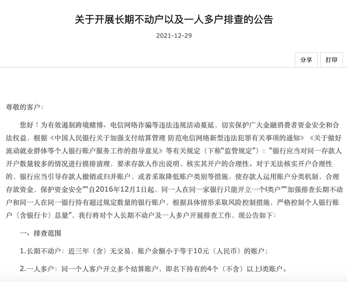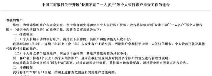 除了工商银行外,中国银行也于2021年12月末发布公告称,将对近三年(含)无交易,余额小于等于10元(人民币)的账户,以及同一个客户开立多个结算账户,即名下持有的4个(不含)以上Ⅰ类账户,开展排查,并按监管规定对上述账户暂停金融服务。