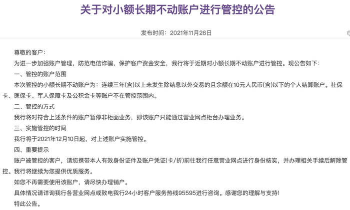 更早之前,光大银行于2021年12月10日开启了对小额长期不动账户进行管控的公告,称将对连续三年(含)以上未发生除结息以外交易的且余额在10元人民币(含)以下的个人结算账户(社保卡、医保卡、军人保障卡及公积金卡等账户不在管控范围内)暂停非柜面业务,即该账户只能通过营业网点柜台办理业务。