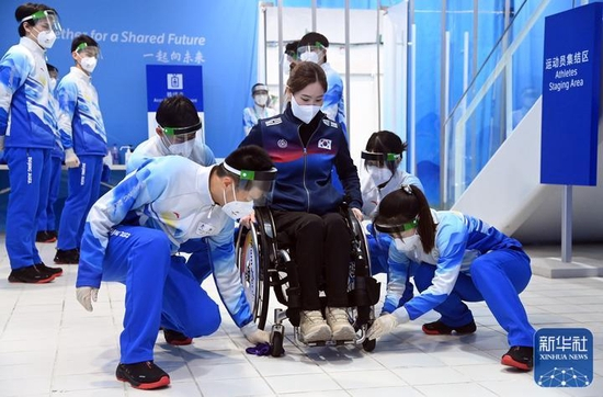 3月6日,在国家游泳中心,志愿者们在轮椅冰壶循环赛前为韩国选手白慧珍清洁轮椅。新华社记者 任超 摄