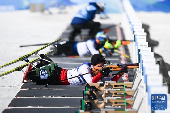 3月5日,中国选手刘子旭在北京2022年冬残奥会残奥冬季两项男子短距离坐姿比赛中。新华社记者 薛宇舸 摄
