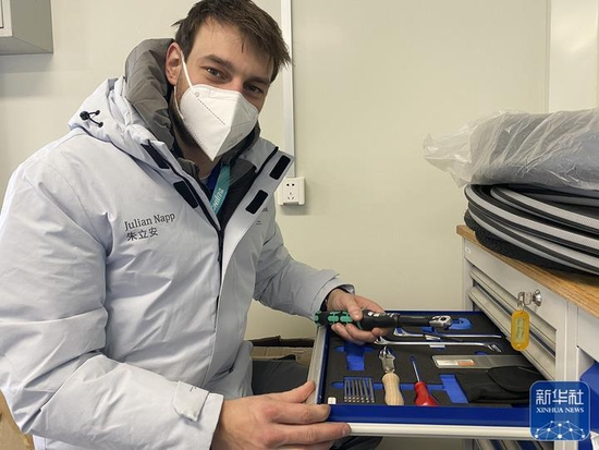 2月25日,在张家口赛区云顶滑雪公园,矫形器、假肢与轮椅维修中心的维修技术人员朱利安·纳普展示工作中需要使用的各类工具。新华社记者 许畅 摄