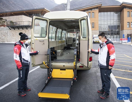 2月28日,工作人员在国家高山滑雪中心展示场馆内的无障碍车辆。新华社记者 孙非 摄