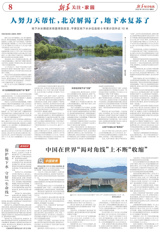 来自北京市水务局的统计数据显示,截至2021年底,北京市平原区地下水水位连续6年回升,超采区面积比2015年最严重时减少82%。不少曾经干涸的泉眼复涌了,市民家门口的“沉睡的河道”又“活”起来了。