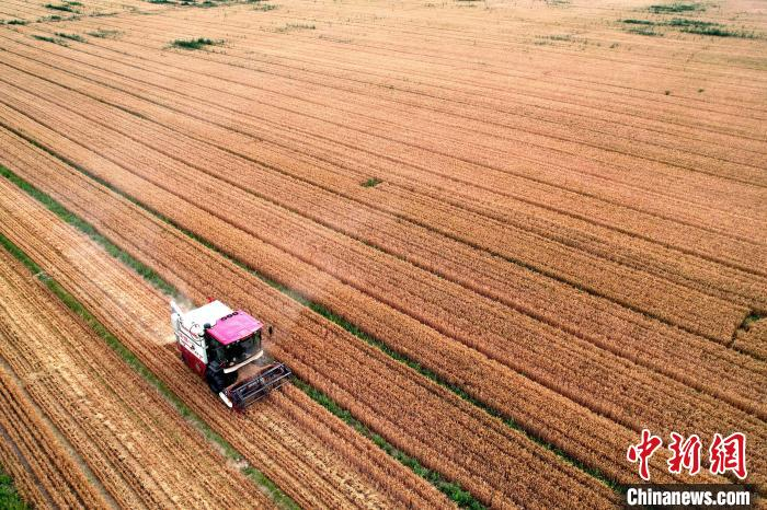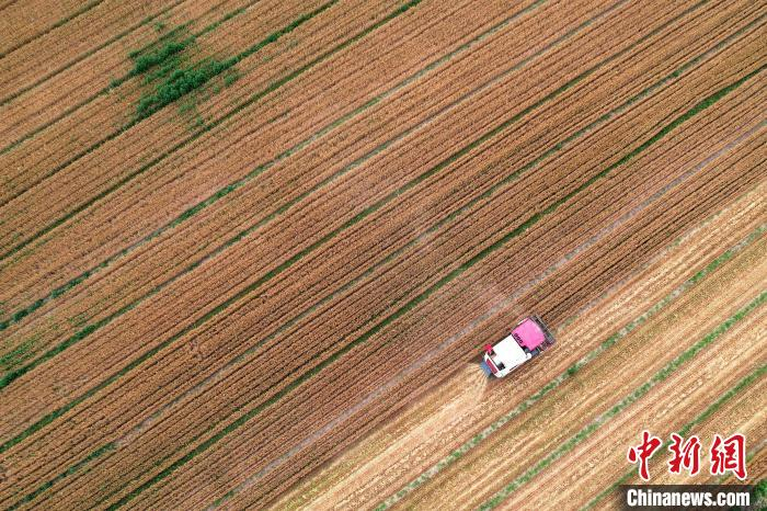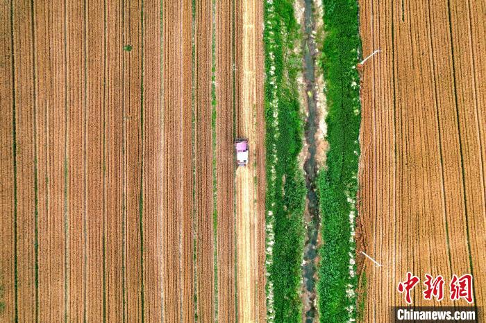 中新网济南6月14日电(孙婷婷)14日,在位于黄河沿岸的济南市章丘区黄河街道金王村中一片20余亩的麦田中,一台大型联合收割机穿梭在金灿灿的麦田中,正以每6分钟收割1亩地的速度“大展身手”。随着收割机轰隆隆地“趟开”麦浪,饱满的麦粒被收入收割机的储粮仓,麦秸被打碎,在收割机的后方抛洒还田,只留下齐整的麦茬,等待抢墒播种。