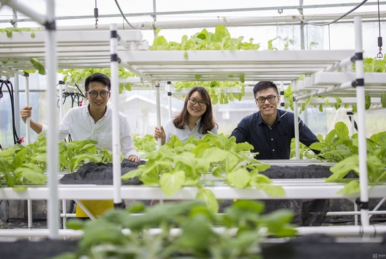 人生轨迹的改变始于一次偶然。大二的时候,梁立锋对学校组织的一个“鱼菜共生”有机种植项目产生了兴趣,他一个人忙不过来,就想起了两位要好的高中同学,谭慧敏和罗伟特。