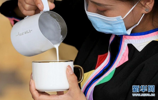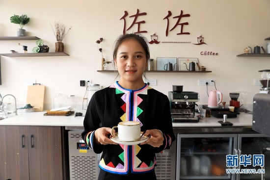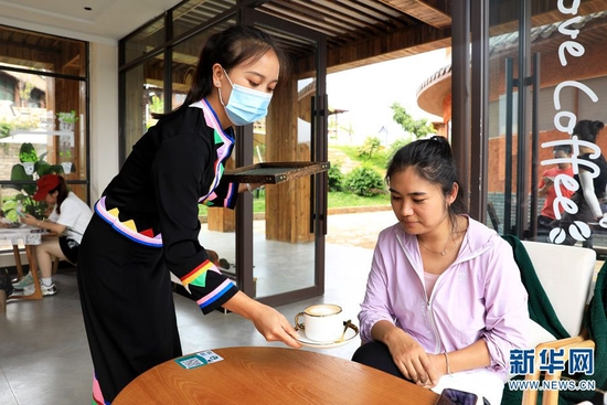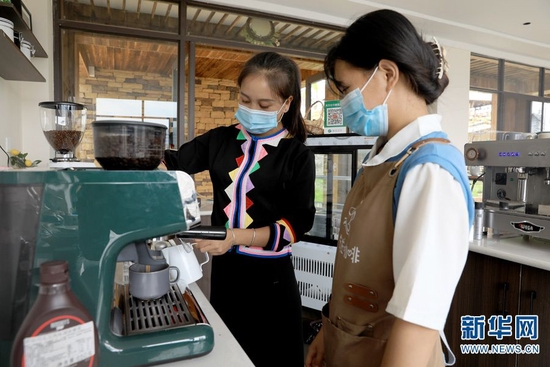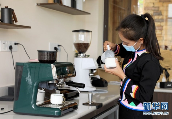随着一系列帮扶项目的落地实施,班利村的面貌一天天发生着变化,吸引着越来越多的游客前来观光,这也让“见过世面”的戈娜四最终决定返乡创业。在当地党委政府的帮助下,2021年,戈娜四经营起了这间名为“佐佐”的咖啡屋,咖啡屋的设备设施免费使用,房租也非常优惠(6月7日摄)。新华网 李浩 摄