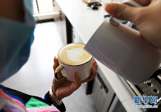 图为戈娜四在冲泡咖啡(6月7日摄)。新华网发(张家杰 摄)