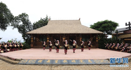 随着精准扶贫和乡村振兴的推进,班利村开始了大变样。2019年起,沪滇协作按照长期帮扶策略,依托班利村交通优势和丰富的民族文化资源,将班利村打造成为集产业发展、文化旅游等为一体的美丽乡村,帮扶项目包括组内道路硬化、现代农业示范园、民族文化展示设施、民族文化传承展示馆等,以农文旅融合巩固脱贫攻坚成果、推进乡村振兴。图为班利村群众表演队在上海市援建的民族文化舞台上表演拉祜族传统舞蹈(6月7日摄)。新华网发(张家杰 摄)