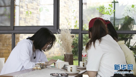 戈娜四还通过抖音等新媒体宣传推广佐佐咖啡屋,吸引了不少游客慕名而来,目前一个月能有八千左右的收入(6月7日摄)。新华网 李浩 摄